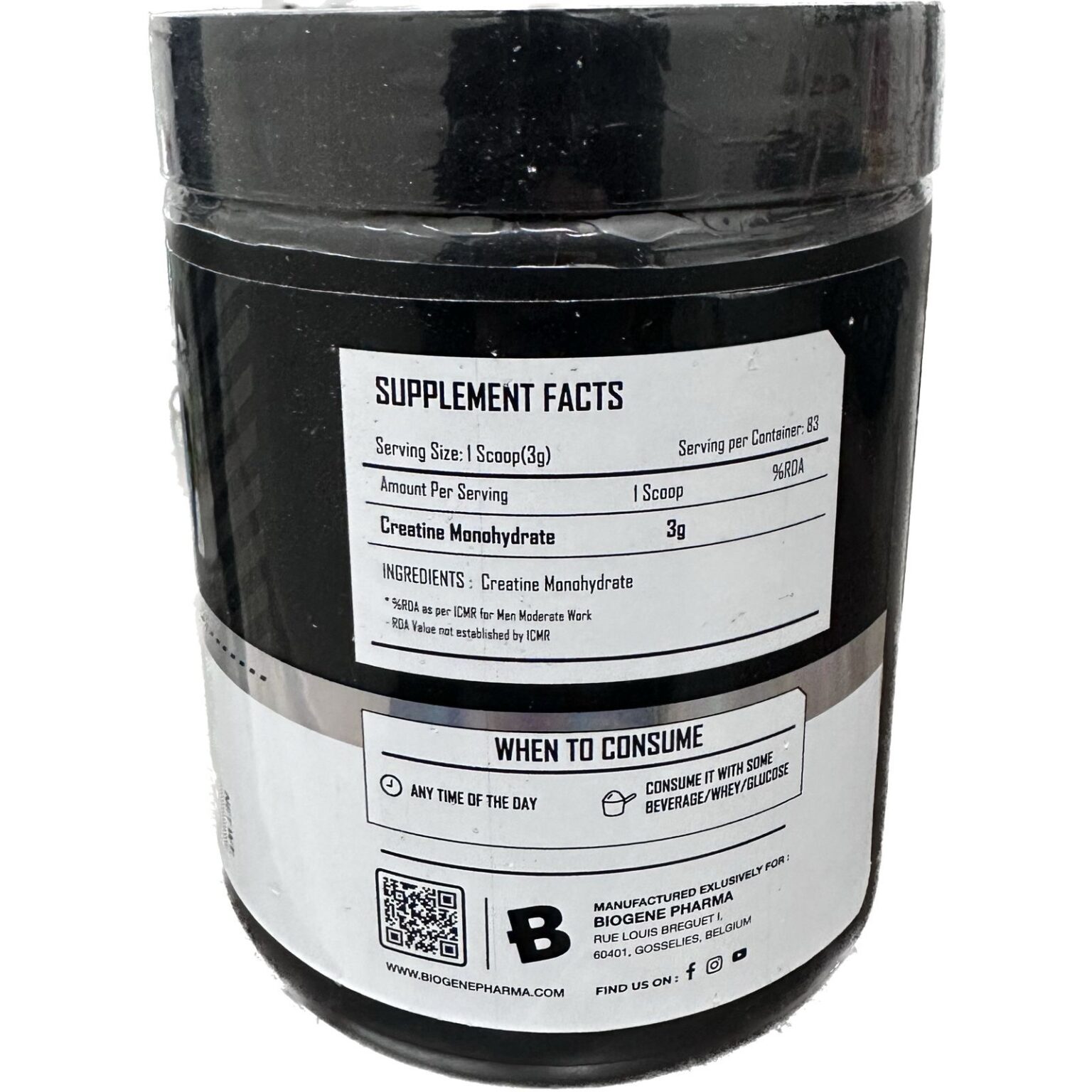 Biogene Pharma Creatine Monohydrate PRODUCT IS ONLY INTENDED TO BE CONSUMED BY HEALTHY, ADULT MEN, 18 YEARS OF AGE OR OLDER. NOT FOR USE BY WOMEN, especially those who are pregnant or nursing. Do not use this product if you have any serious medical conditions. Before using this product, consult with a licensed, qualified, health care professional, including but not limited to, if you suspect you have or have been treated for, diagnosed with or have a family history of any medical condition, or if you are using any prescription or over the counter medication. Immediately discontinue use and contact a medical doctor if you experience any adverse reaction to this product. Discontinue use 2 weeks prior to surgery. Do not use if safety seal is broken or missing. Store in a cool dry place. KEEP OUT OF REACH OF CHILDREN.