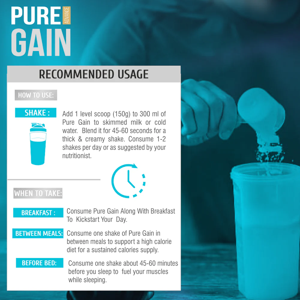 Add 1 level scoop (150g) to 300ml of Pure Gain to skimmed milk or cold water. Blend it for 45 to 60 seconds for a thick & creamy shake.