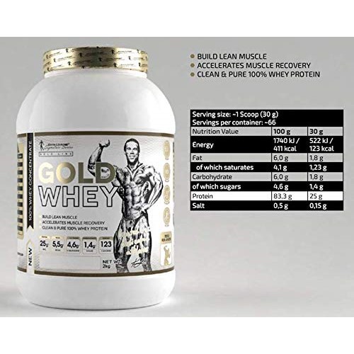 Kevin Levrone Gold Whey Protein. With sweeteners. Whey protein concentrate powder for preparing high protein shakes. The product is designed for athletes and physically active people with a higher demand for proteins. Protein contributes to the maintenance and growth of muscle mass.