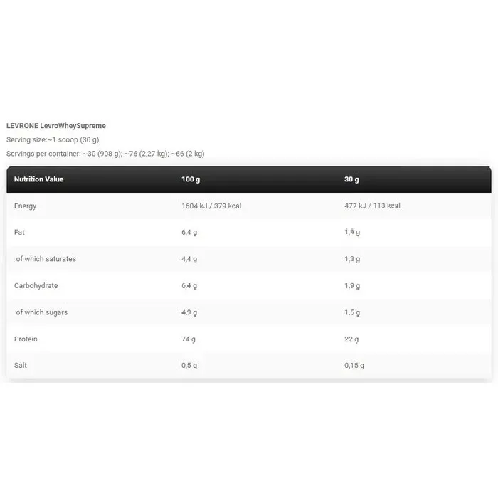 LEVRONE LEVRO WHEY SUPREME is a high-protein supplement which enables you to enrich your daily diet with complete proteins. The formula consists mainly of high-quality whey protein concentrate (WPC) – one of the most popular forms of proteins chosen by recreational and professional athletes. The protein used is a rich source of valuable amino acids, including the exogenous BCAA complex. The nutrient is available in 12 incredibly delicious flavours, and its effortless solubility enables it to be used as a meal supplement (e.g. in fruit shakes, oatmeal or desserts).