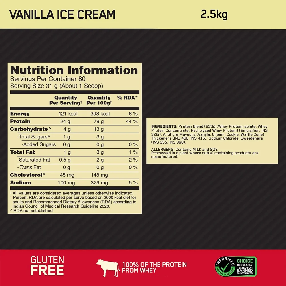 Optimum Nutrition (ON) Gold Standard 100 Whey Protein combined with ultra-filtered whey protein concentrate, each serving provides 24 grams of all-whey protein and 5.5 grams of naturally occurring Branched Chain Amino Acids (BCAAs) which are prized by athletes for their muscle-building qualities.
