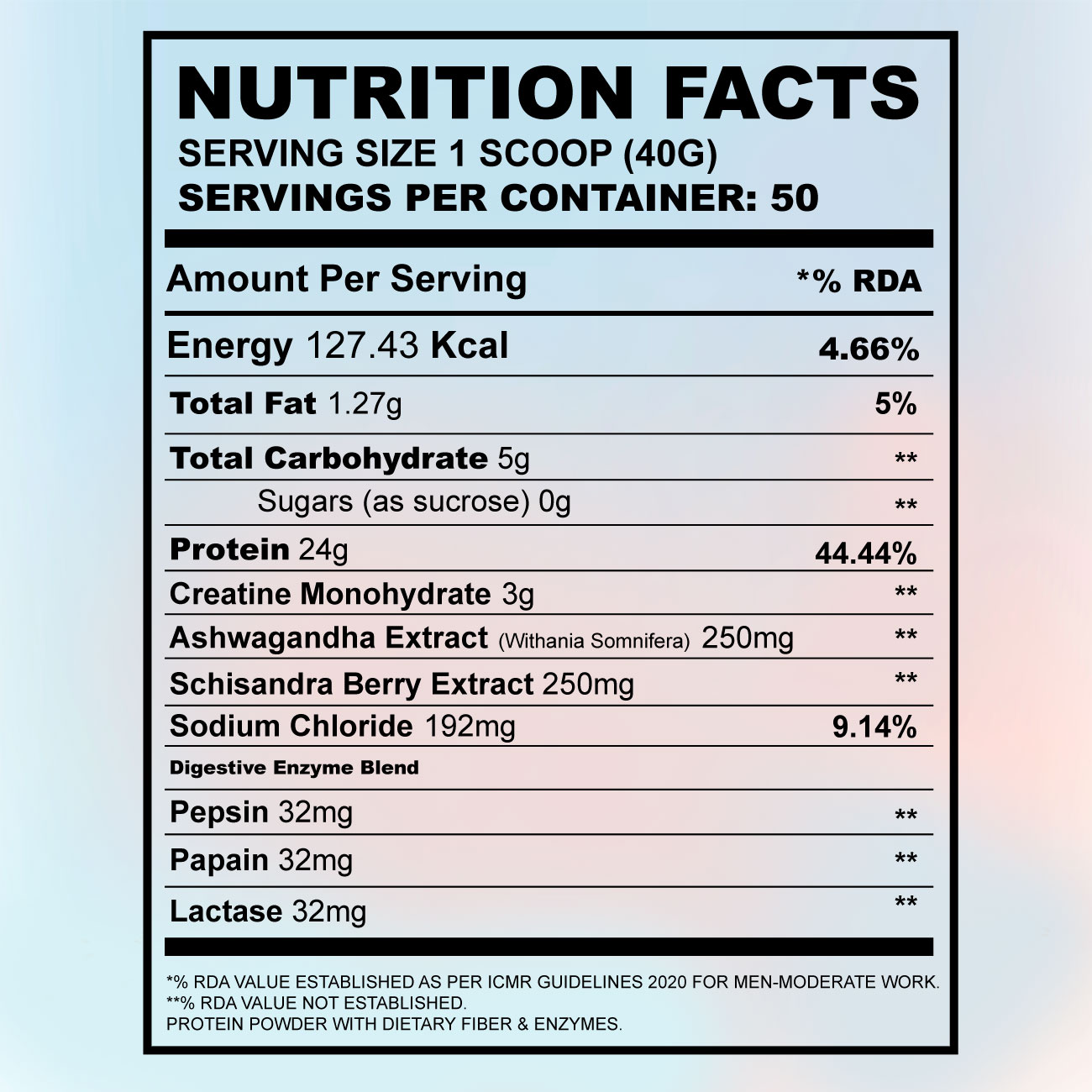 Whey Protein Concentrate, Skimmed Milk Powder, Creatine, Ashwagandha Extract, Schisandra Berry Extract, Cocoa Powder/Strawberry Flavour, Digestive Enzymes (Pepsin, Papain, lactase), Sodium Chloride.
